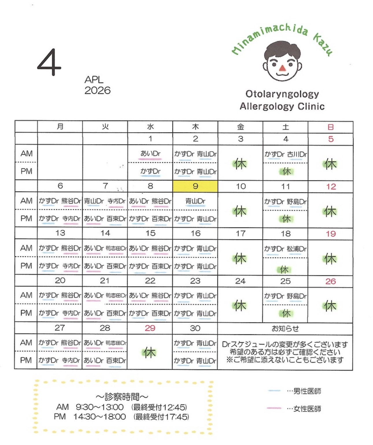 医師の変更が色々ありますので、担当医ご希望ある方はよく見て来院下さい。